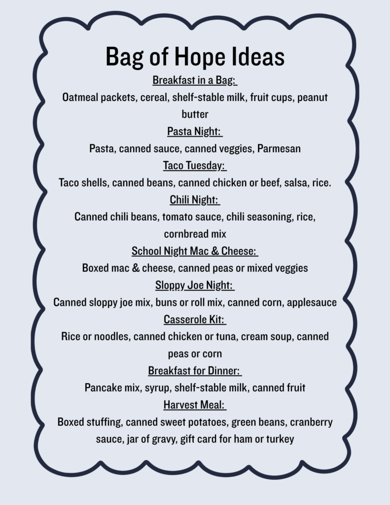 Community members are encouraged to fill a reusable grocery bag with nonperishable foods that work together to create wholesome meals—with simple ideas like Taco Tuesday, Breakfast for Dinner, or School Night Mac and Cheese.