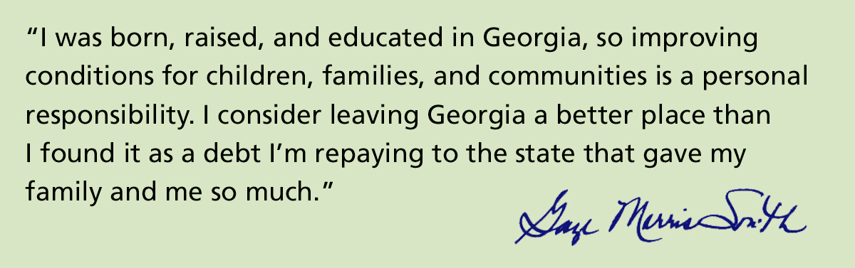Gaye Morris Smith was working to improve the lives of Georgia’s children long before her appointment as Georgia Family Connection Partnership (GaFCP) executive director in 2001. A public/private nonprofit created and funded by the state and the private sector, GaFCP connects local, state, and national partners in their efforts to ensure that every child, family, and community in Georgia is healthy and thriving.